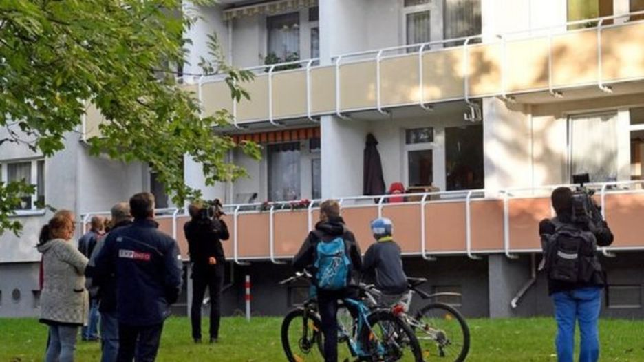 | watu wakishuhudia msako wa polisi wa mshukiwa huyo nyumbani kwake huko Chemnitz |