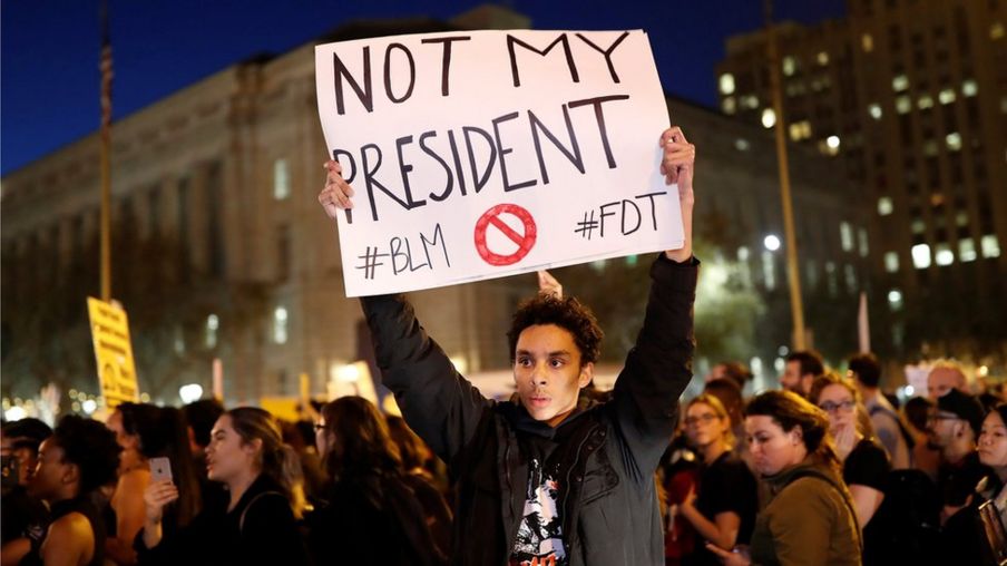 Mamia ya waandamanaji wanaompinga Trump walikusanyika nje ya jumba kuu la Bw Trump, Trump Tower eneo la Manhattan jijini New York Jumatano jioni, wakibeba mabango yaliyokuwa na ujumbe "Not my president" (Si Rais wangu), pamoja na mabango mengine.